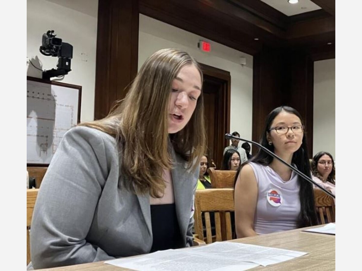 Kate Cressey and Nadia Romanazzi, advocates with the Mass Speaks Coalition, testify on language access bills before the Joint Committee on State Administration and Regulatory Oversight on Tuesday, July 22, 2025.