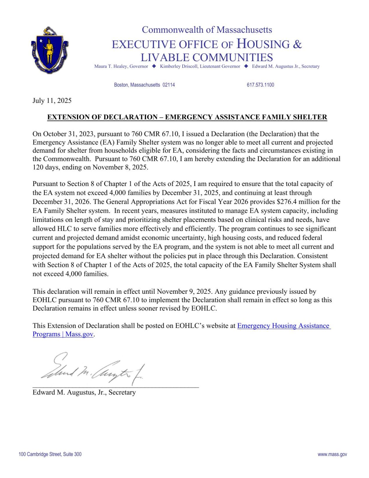 The secretary extended his 2023 declaration for another 120 days, until Nov. 8, 2025. When he issued the original, Augustus said he had "determine[d] that the maximum capacity of the Emergency Assistance program is approximately 7,500 families," more than double its current caseload.