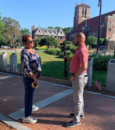 It was her presence that drew WBZ TV meteorologist and feature reporter Jacob Wycoff, who interviewed her prior to the event. Wycoff then used a handheld device and a drone to record the rest of the ceremony and Hozempa’s rendition of Taps. It does not appear that the segment has yet appeared on WBZ.