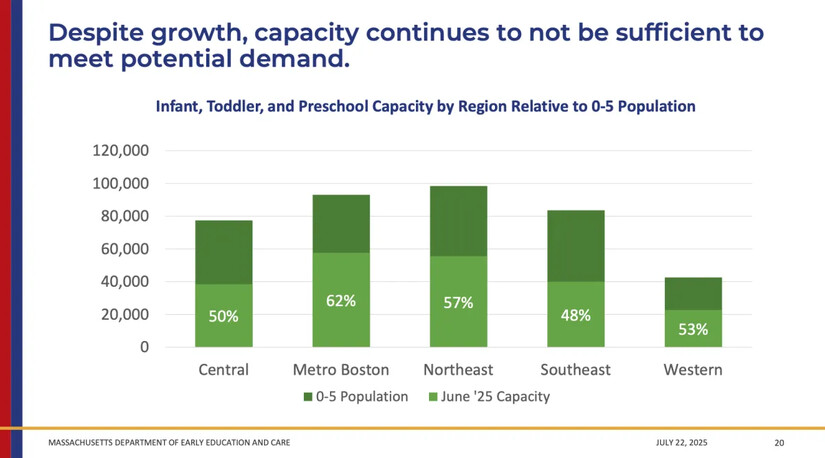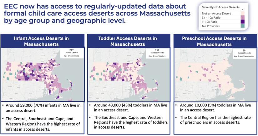 Around 59,000 (70 percent) of infants, around 43,000 (43 percent) of toddlers, and around 10,000 (5 percent) of preschoolers in Massachusetts live in an access desert. The state defines this as areas where for every three children there is only one child care slot, though there are regions particularly in central Massachusetts where the ratio is greater than ten children to one slot.