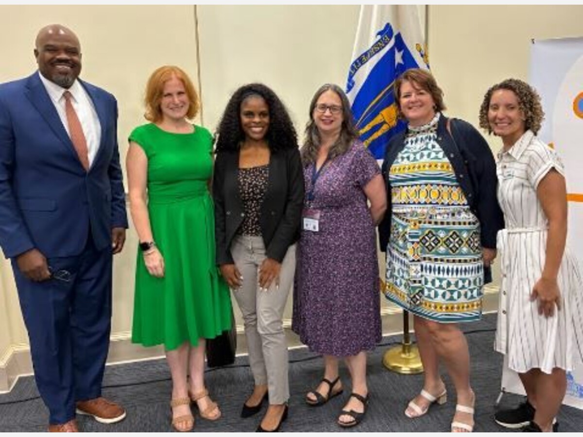 From left, Secretary of Education Patrick Tutwiler, BICO Professional Development and Curriculum Specialist Ann Buckley, DESE ELA/Literacy Content Specialist Octavia Nixon, Department of Early Education and Care Early Literacy Practice Specialist Jennifer Crandell, Bi-County Collaborative Executive Director Jeanne Sullivan, and DESE ELA/Literacy Content Specialist Lori McNally at the Literacy Launch event at the Easthampton Public Library on Aug. 18. (Photo Courtesy Bi-County Collaborative)