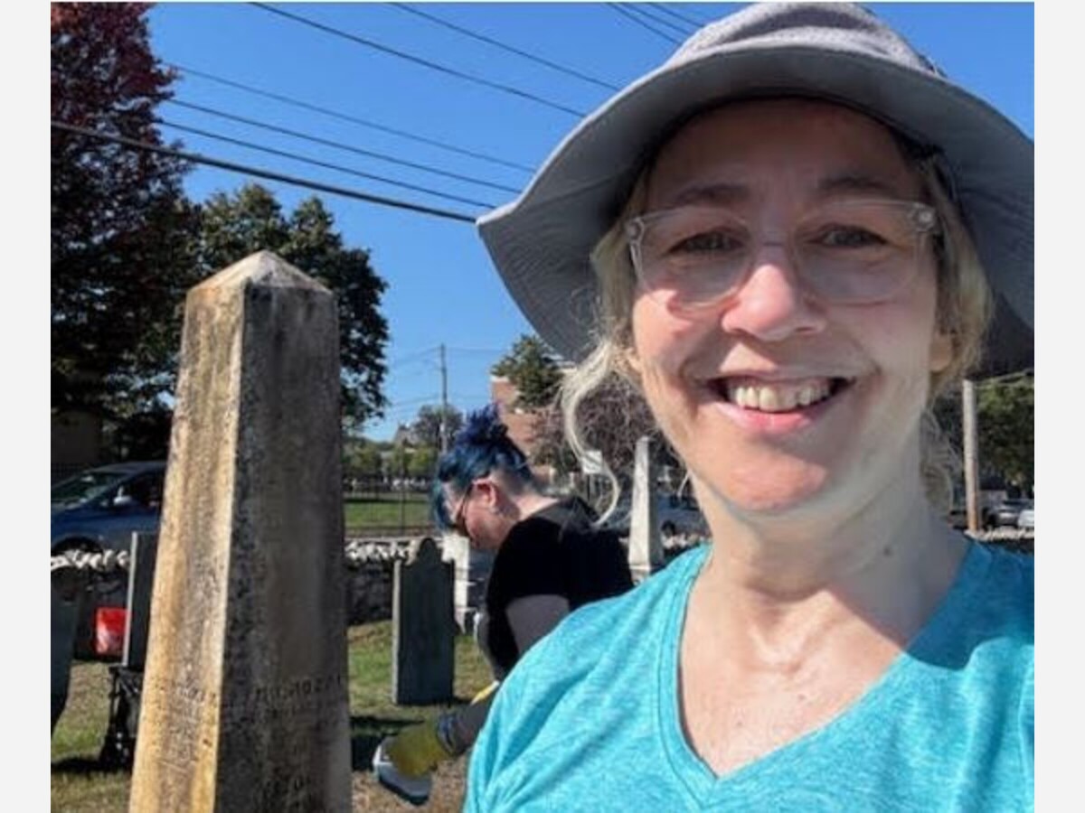 The initiative, launched by Robin Bowman while she was at Dean College (she is now employed at Tufts University), involves cleaning and preserving historic grave markers in the oldest section of the cemetery. Dean faculty members, as well as Bowman, who returned for the day, along with Dean students and residents, participated on Sunday, Oct. 5