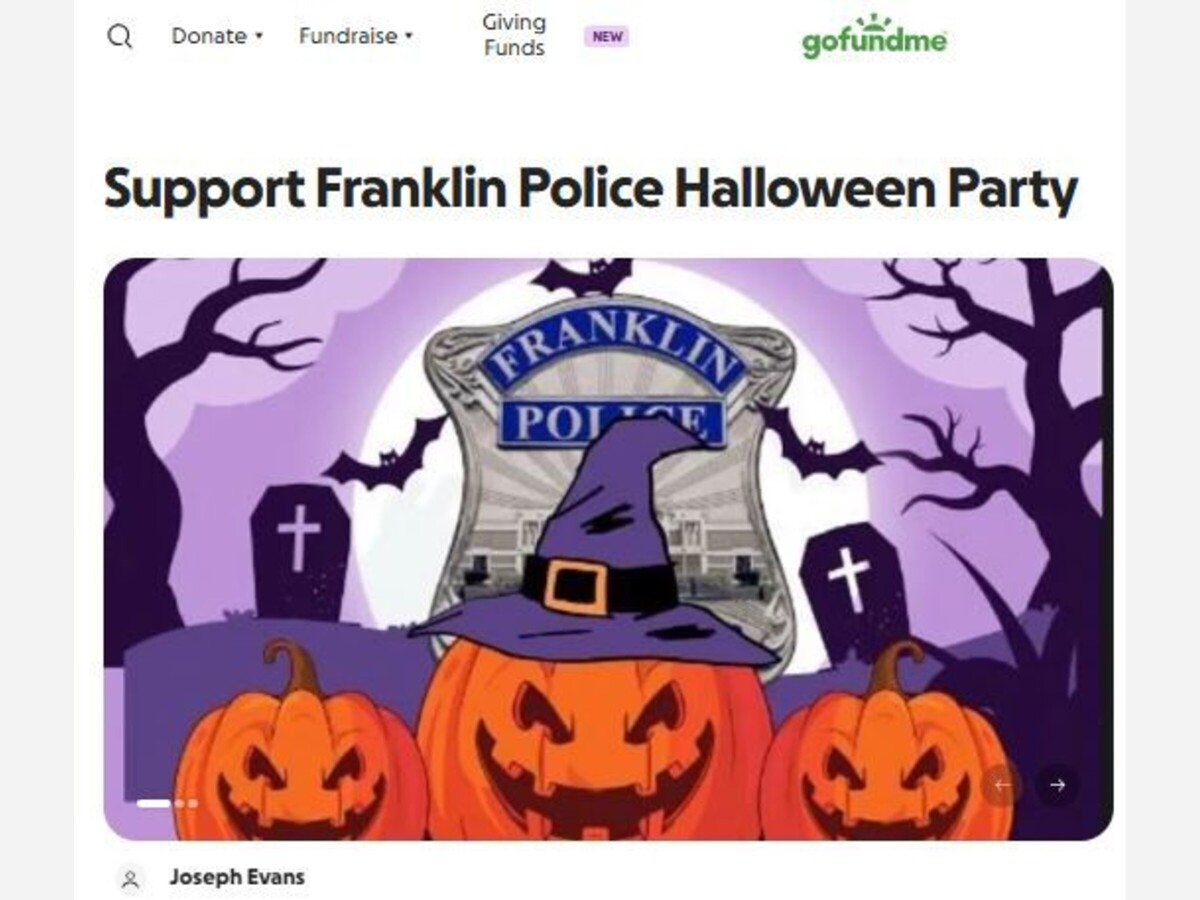 After the surprise announcement that the traditional Franklin Police Halloween Trunk or Treat (and more) had been cancelled due to the failure of multiple overrides, a local, Joseph Evans, took to the pages of GoFundMe to try to engineer a rescue. He wrote, in part: "These funds will be used to fund in whatever way possible the Franklin Police Department Halloween party. WCVB Channel 5 Boston insinuated the NO voters...were to blame for this. Please join us in funding this event.... Signed, the NO voters."