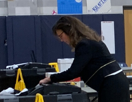 Above, just before 5 am today, Town Clerk Nancy Danello prepares a voting machine.