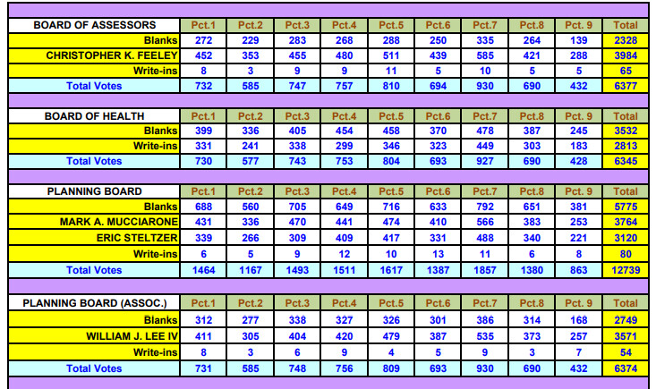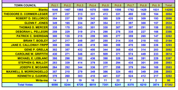 Most significantly, four long-serving Councilors, Chair Tom Mercer, Clerk Glen Jones, Councilor Deb Pellegri, and Councilor Patrick Sheridan lost out to newcomers. The only incumbents to survive the slaughter were Vice Chair Robert Dellorco and Councilor Ted Cormier-Leger.