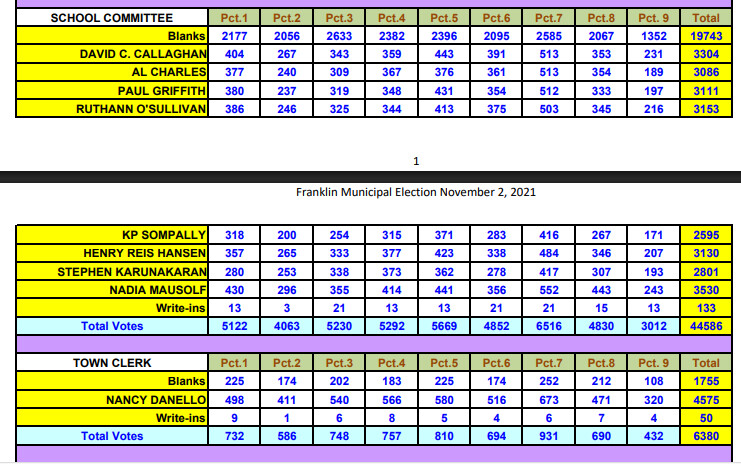 The top Town Council vote getter was Caroline Griffith, who is married to reelected School Committee member Paul Griffith, with 36114 votes.