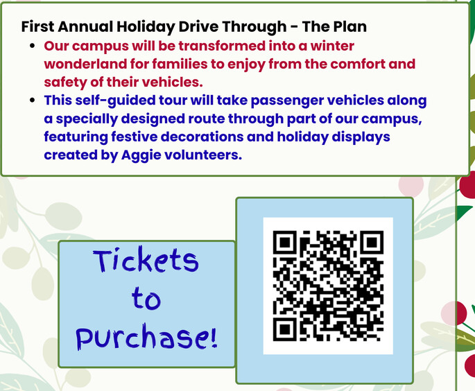Excitement is in the air! Norfolk Aggie's first ever Holiday Drive Through event is coming up! Join us as you drive through our beautifully decorated campus and enjoy the magic of the holidays with an Aggie flair!