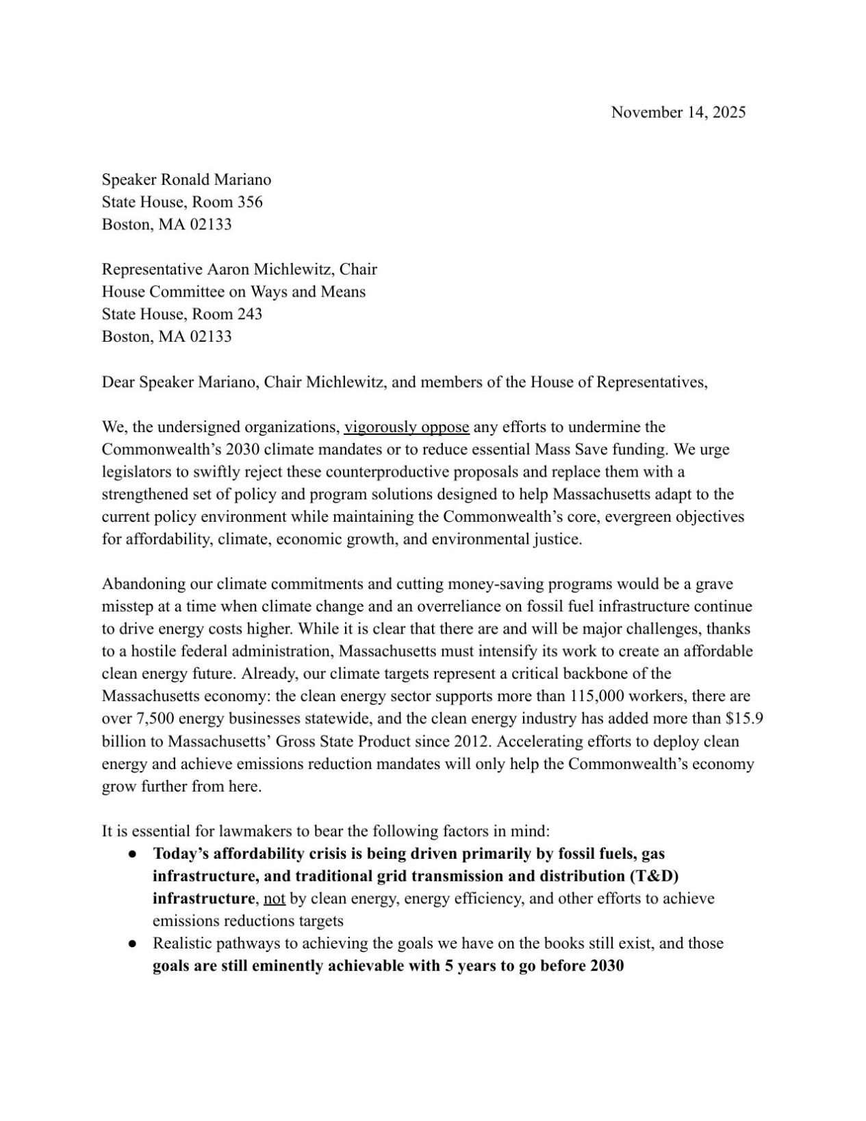 More than 100 climate and environmental groups have been urging the Legislature to reject any effort to weaken the 2030 mandate or reduce Mass Save funding. In a Nov. 14 letter to Mariano and Michlewitz, the groups wrote that they "vigorously oppose any efforts to undermine the Commonwealth's 2030 climate mandates or to reduce essential Mass Save funding."