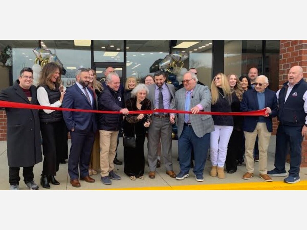 Ribbon cutting for Sachs Jewelers in the Franklin Village Mall on Thursday. Far left, Town Coucilor Max Morongiello and far right, United Chamber President, Jack Lank. In center, from left, Town Clerk Nancy Danello, Nicholas Sachs, State Rep. Jeff Roy, Marilyn Sachs, family matriarch cutting ribbon, Timothy Sachs, and Karl Sachs.