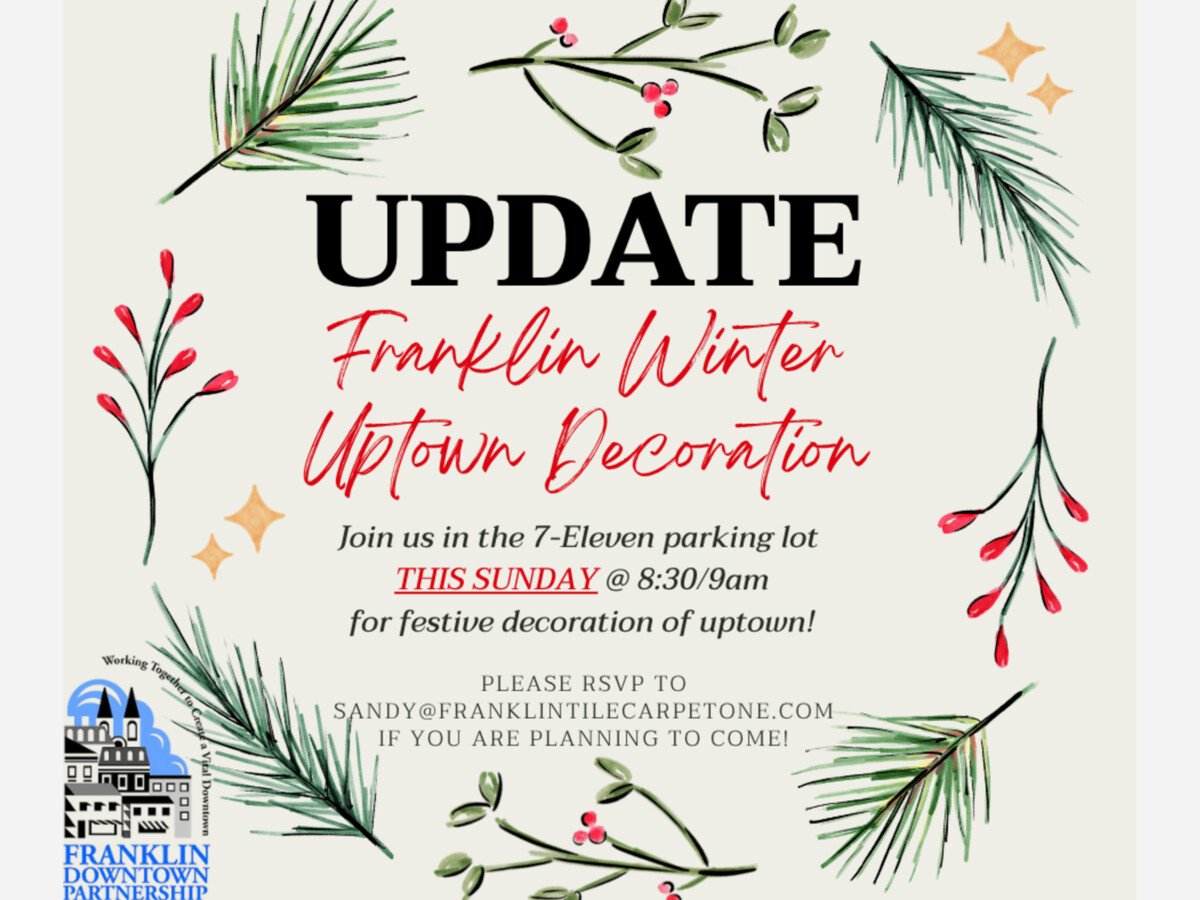 “We apologize for the date change. We are dedicated to making the downtown area festive during the holiday season,” said Mason, also a member of Franklin Garden Club. “The decorations make Franklin even more attractive to people who go downtown to enjoy shopping, dining and entertainment.”