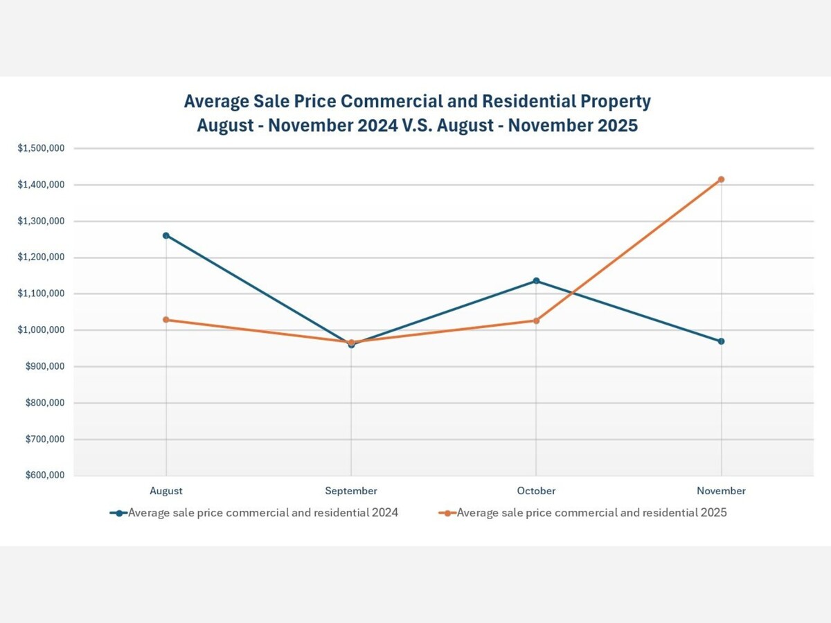 The average sale price for commercial and residential properties in November was $1,415,648.74, a 46% increase from November 2024 and up 38% from October 2025. This figure was significantly influenced by a single high-value commercial property sale of approximately $205 million, which skewed the average upward. The total dollar volume of sales reached $840.9 million, up 32% year-over-year and 4% from October.