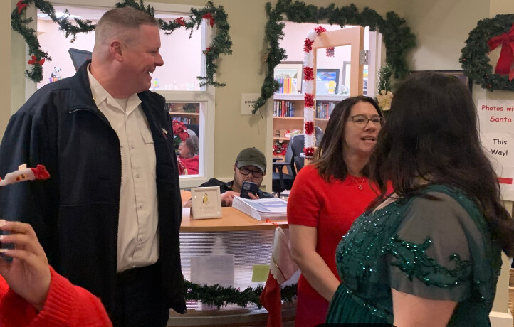 While other members of the department showed off the town's Tower Truck outside, for the young and young at heart, Fire Chief Charles Allen ventured inside for a time to check on the festivities and to chat with Senior Center Director Sarah Amaral (at right, wearing green).