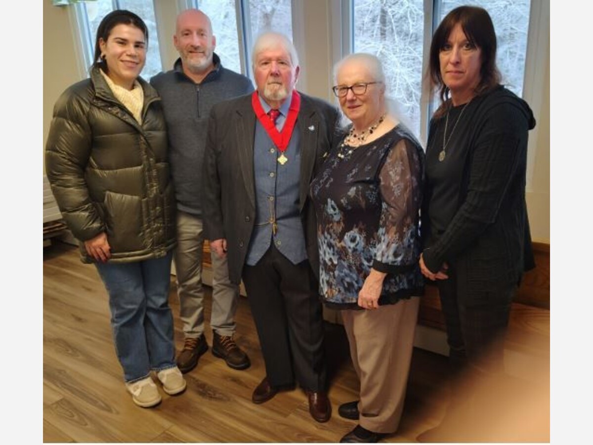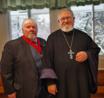 The national Episcopal Church and Scouts America awarded Franklin's Randy LaRosa with the prestigious National St. George Award Sunday at St Johns Church in Franklin, above, left to right, Randy's daughter-in-law Samara, son, Randy, Randy himself, wife Denise and daughter Kara. The award was presented by Arch Priest John Bacon of the Eastern Orthodox Church, pictured below with Randy.