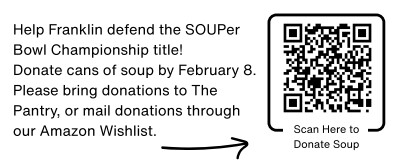 The Franklin Food Pantry has been experiencing a significant increase in the number of households visiting The Pantry. In November and December, experienced 2,461 visits—a 34% increase from the same period last year. Visitors include veterans, seniors on fixed incomes, and families facing unexpected hardships. To help meet the demand for food assistance, and to bring attention to food insecurity, the pantry is participating in SOUPer Bowl 2026—a spirited canned soup drive competition between the Franklin Food Pantry and Weymouth Food Pantry. Last year, our two communities collected nearly 5,000 cans, with Franklin winning by just 205 cans!