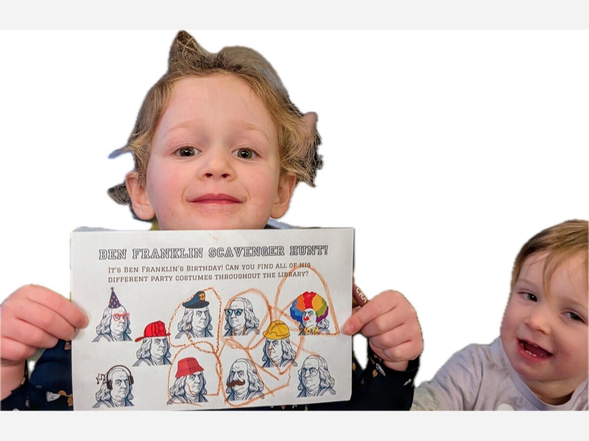 Above, two toddlers enjoy the Frankin Public Library Children's Room Ben Franklin scavenger hunt while their dad participated in the annual Ben Franklin Autobiography Franklin Read-A-Thon. The events in Ben Franklin month included two concerts, a talk by Harvard author Joyce Chaplin on Franklin as an environmentalist, and a birthday bash oriented toward kids. The events for 2027 are in the planning stage!