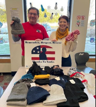 Above, Michael Shain of Thanks To yanks and Samantha Cesario, of the Milford Public Library. Recently the library sponsored a donation collection drive of new winter clothing , the items pictured will be given to local military families. Thanks To Yanks is a local charity that supports, area veterans, those deployed and military families.