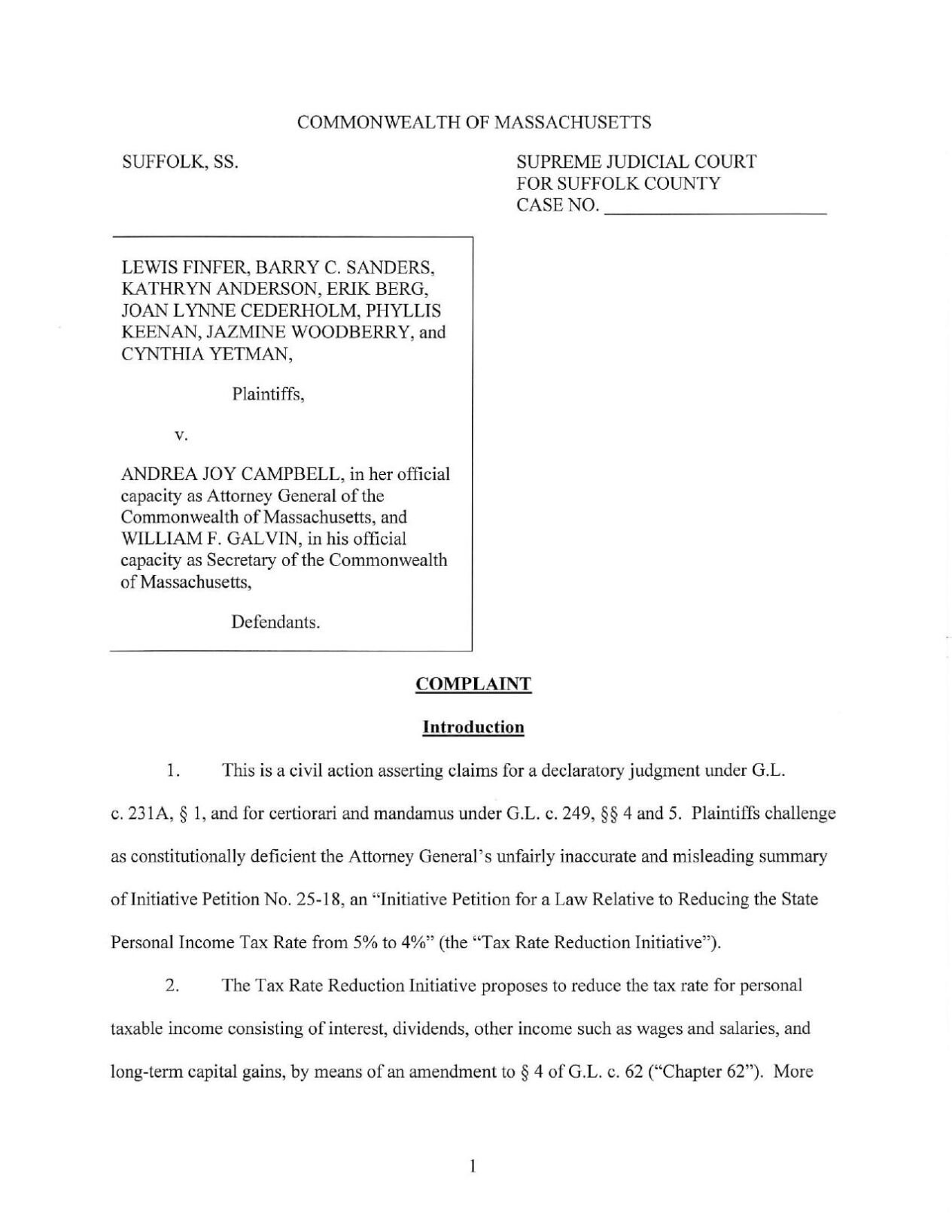 “This initiative would bring the Trump playbook here to Massachusetts, giving the biggest tax cuts to millionaires and billionaires while the rest of us get a few hundred dollars a year and simultaneously see our healthcare taken away, our roads and bridges filled with potholes, and our schools and colleges closed," said plaintiff Joan Cederholm, a retired Weymouth Public Schools employee.