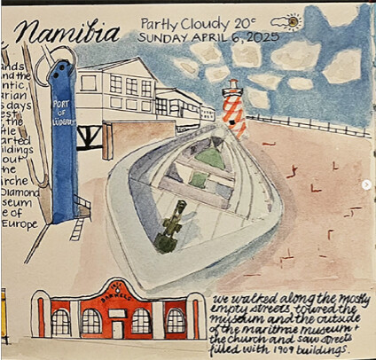 Because her recent world cruise moved quickly from port to port, many of her sketchbook pages were created from her own travel photographs; blending on-location experience with her reflective drawings. This hybrid approach forms the foundation of her newly published book, “Port to Port: A sketchbook Journey Around the World”.