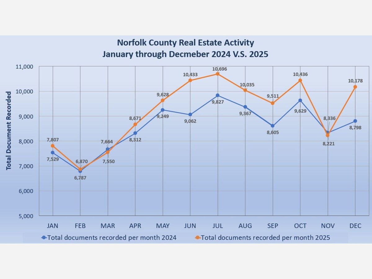 Norfolk County Register of Deeds William P. O’Donnell reports that Norfolk County recordings for 2025 show greater real estate activity compared to 2024, with increases in both the total number of deeds and mortgages recorded.