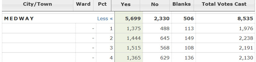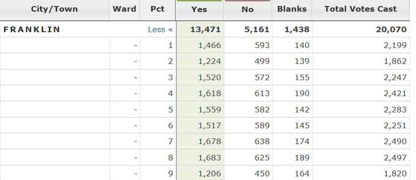 Voters in the state overwhelmingly supported the ballot question [Question 1 on the 2024 ballot] supporting an audit, and according to polls, continued to do so. Election results for Norfolk County as a whole, are summarized above, and for Franklin and Medway, below: