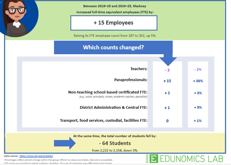 According to Edunomics, many districts added staff with the generous temporary federal relief fund of the Biden era at the same time that many district began to see enrollment fall. The situation has led to uncomfortable policy choices in many communities, including Franklin. The Edunomics WANDA data set allows number crunching on a number of aspects of funding. Below are snapshots for both Franklin (which lost 587 students and gained 32 employees) and Medway (which lost 64 students and gained 15 employees).