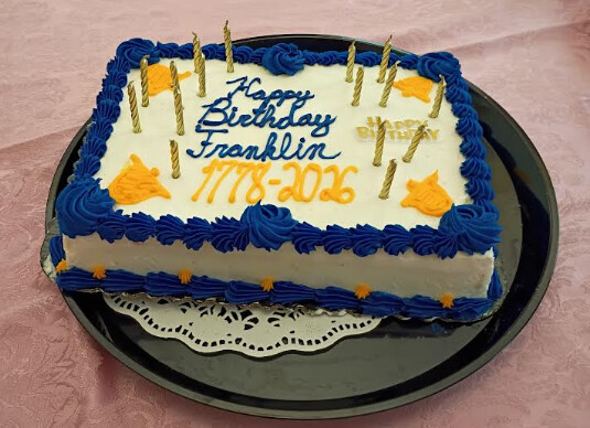 On Sunday, a healthy crowd of people came to watch the 'home movie' of Franklin's 200th celebration in 1978 and to celebrate Franklins Birthday (technically, today, Mar. 2) with cake and refreshments. And, of course, visitors also enjoyed looking at the displays in the museum.