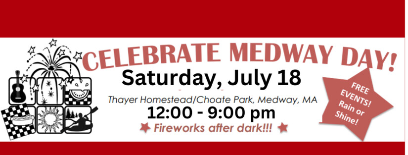 The combined event will be on Saturday, July 18, 2026, from 12:00–9:00 PM at Choate Park for the newly combined Celebrate Medway Day, culminating in a spectacular fireworks display.