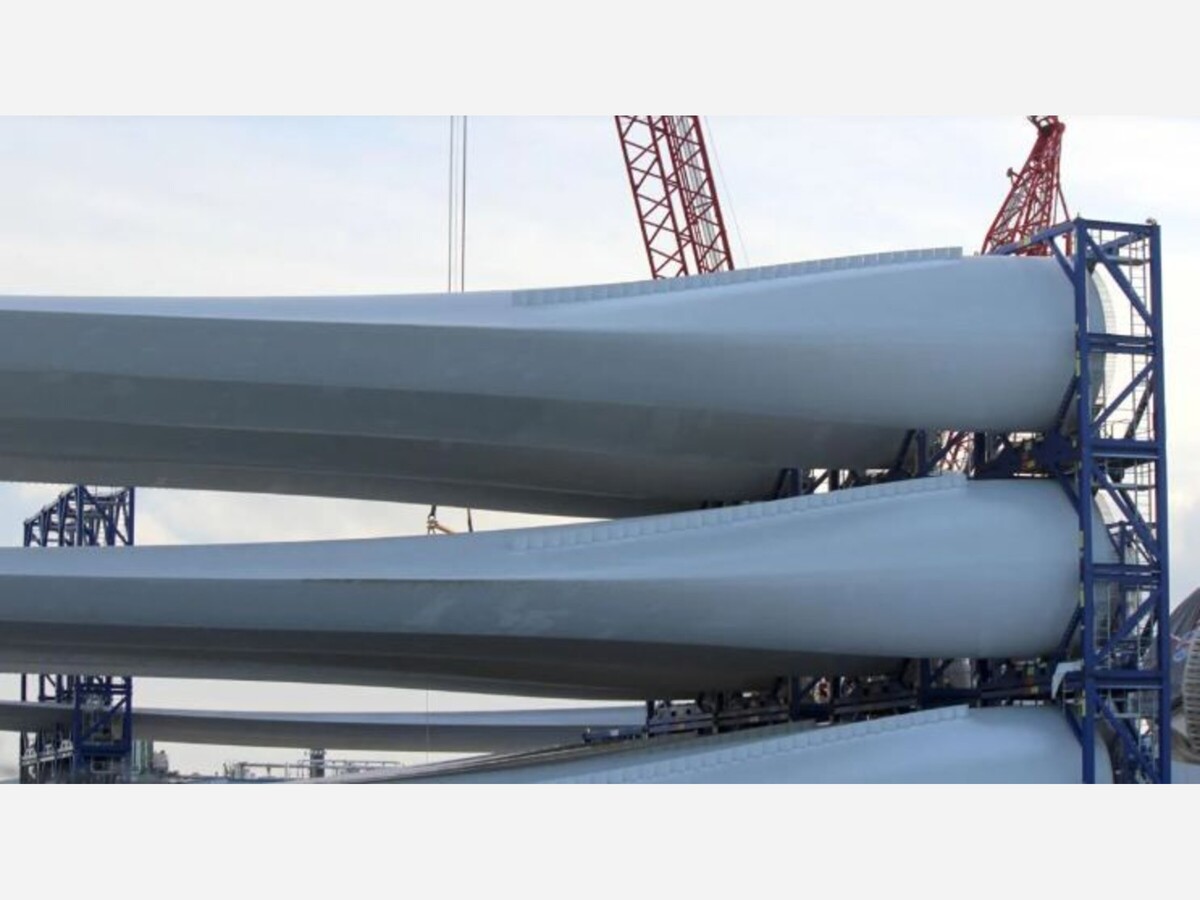 Above, wind turbine blades sit near Vineyard Wind's New Bedford offices on Jan. 23, 2025. (Michael P. Norton/SHNS). Offshore construction on the first offshore wind project to serve Massachusetts is done. The final blades of the Vineyard Wind 1 project were installed Friday evening, a Vineyard Wind spokesman said, completing the project's offshore construction program. The spokesman said the project continues to deliver some power to the New England grid. More work remains before the project is fully operational.