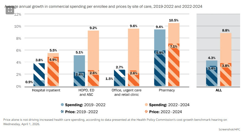 While average commercial health care spending grew by 8.8% from 2022 to 2024, less than half of that jump was driven purely by price growth, said David Auerbach, the Health Policy Commission's senior director of research and cost trends.