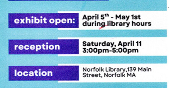 The Franklin Art Association is pleased to invite the public to their Spring Art Show Opening Reception at the Norfolk Library Gallery area on Saturday, April 11 from 3-5 PM. The Library is at 138 Main Street, Norfolk Center.