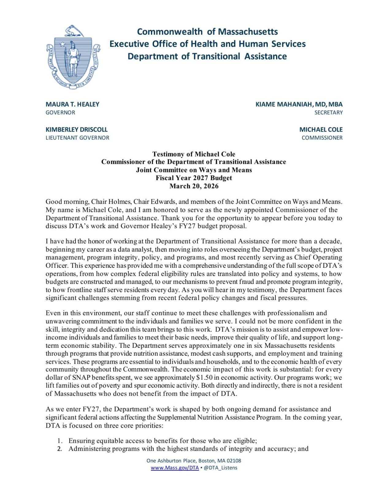 Dublois also pointed to federal data to argue that "more than $1 billion was erroneously spent in the Massachusetts SNAP program from 2022 to 2024 alone," and warned that, under new federal rules, the state could face hundreds of millions of dollars in penalties if error rates remain elevated.