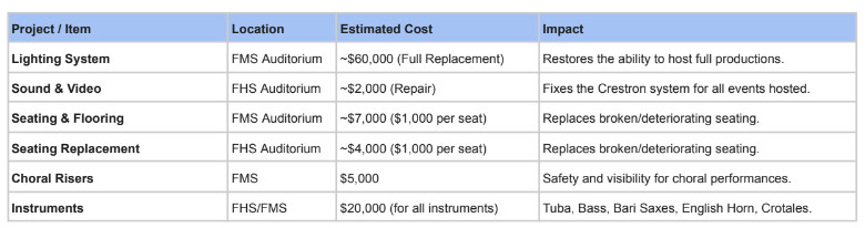 The performing arts in our schools have experienced reductions in staffing and programming over the years due to budget constraints. However, we believe this community, one that deeply values the arts, can help reverse that trend by revitalizing our facilities and creating a space where students can truly thrive.