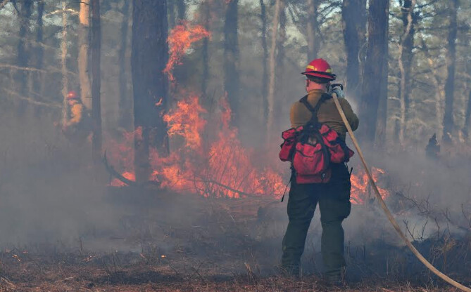 A Department of Conservation & Recreation wildland firefighter directs a handline at an outdoor fire. Massachusetts sees more than 1,000 wildland fires each year, but simple steps can reduce the risk that one will spread to your home.
