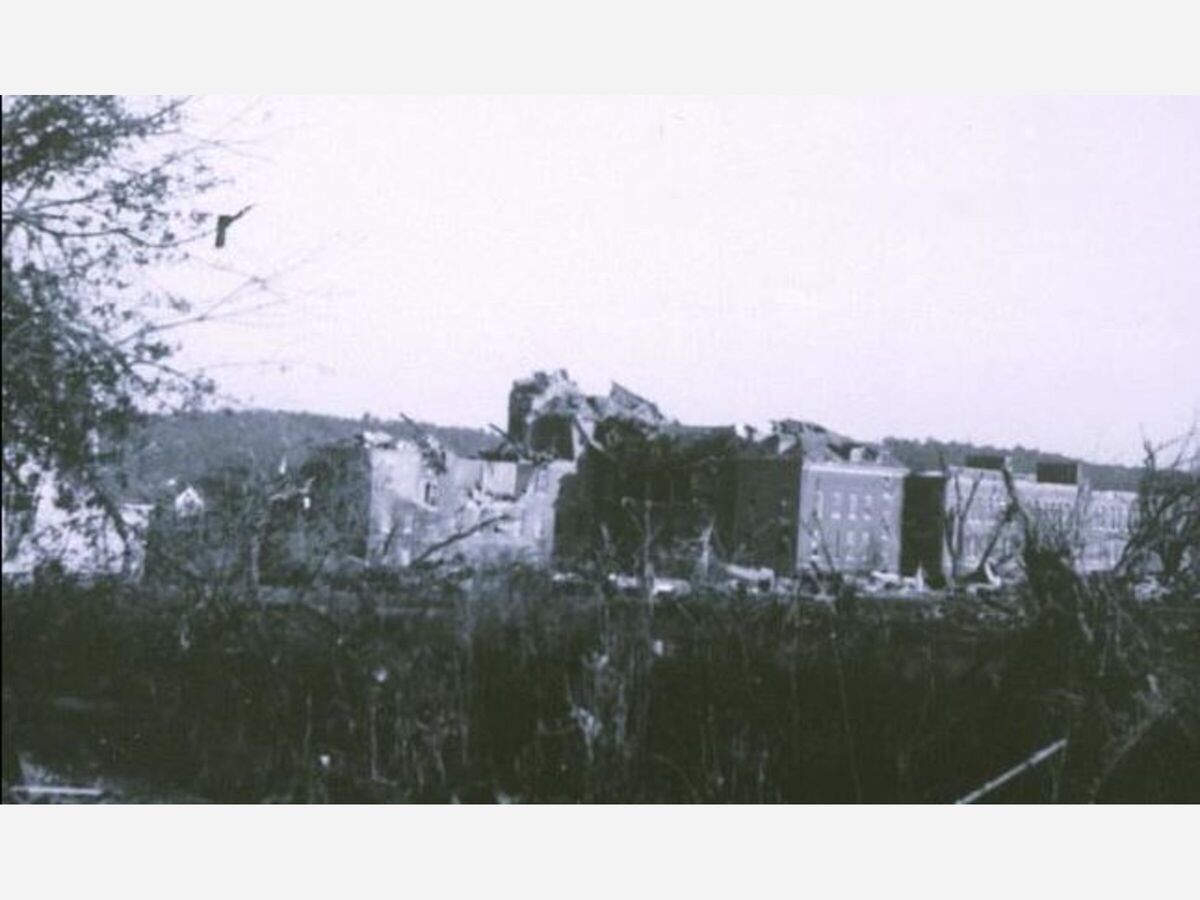 Above, damage to Assumption College in Worcester from the 1953 twister. The building is now used by Quinsigamond Community College. (NWS photograph)