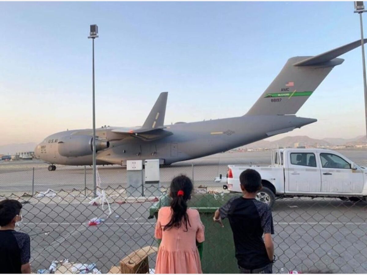 Onlookers watch as an American military aircraft sits in Kabul International Airport (Photo by anonymous/Provided by Madiha Gomaa