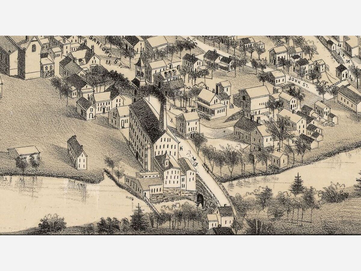 Above, "birds-eye view" of Sanford Mill Dam on the Franklin-Medway line in 1887.